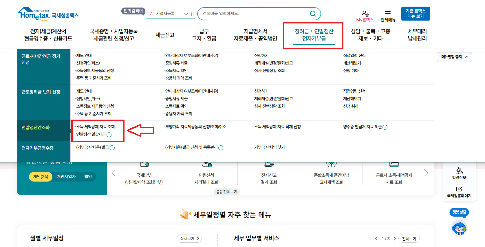 - 자료 조회 및 내려받기: 필요한 소득·지출 자료를 조회하고, 내려받아 연말정산 신고서에 첨부합니다.