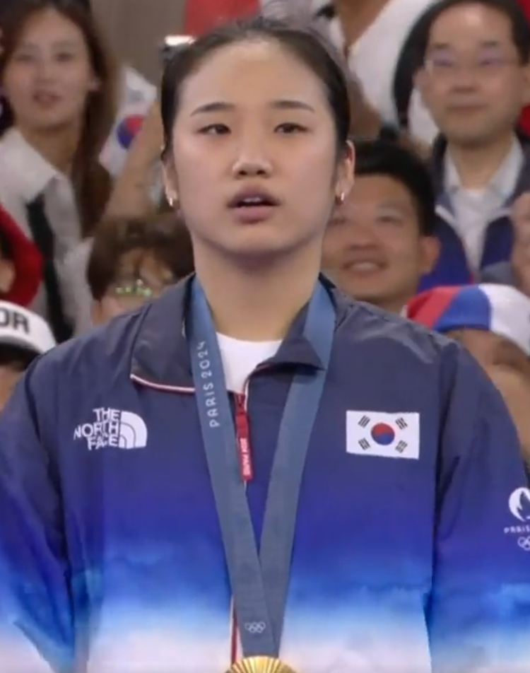 안세영 선수는 2024년 파리 올림픽 배드민턴 여자 단식 결승전에서 중국의 허빙자오를 2-0으로 물리치며 역사적인 금메달을 목에 걸었습니다.